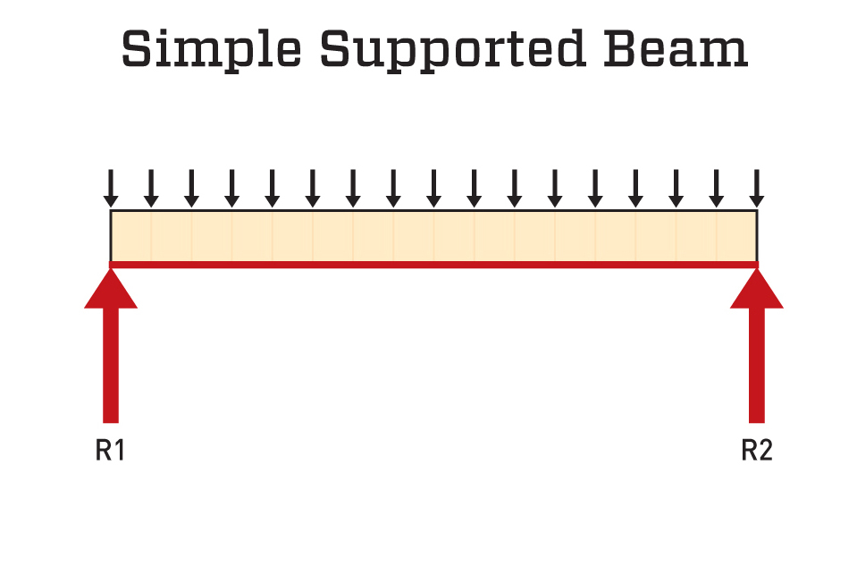 A simple supported beam (top) is one supported at each end. Half of the uniform load spread across the beam’s length equals the “reaction force” at each end. Between the supports, the beam can bend and flex. To begin to measure the load on the beam, we need to look at the “tributary load”—the portion of the loads on other framing members that feed into the beam. In this case (plan view of a floor frame above), a floor beam supports half the load on the joists on both sides. The other half of the load on the joists is supported by the foundation walls on each side