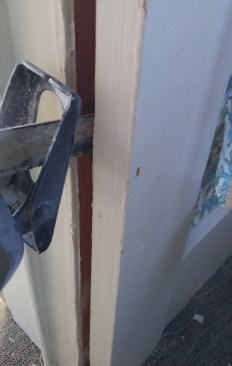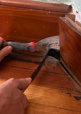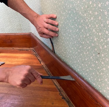 After breaking the hold of the finish, begin to pry things apart. Go slow. Think at first of just loosening the parts, not ripping pieces off. I like to work with two pry bars in tandem.