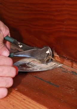The last board installed will be the first board to come out, but it’s often hard to get it out intact. Once the fasteners are disabled, try to loosen the board by driving it away from the tongue on the next board, as shown below.