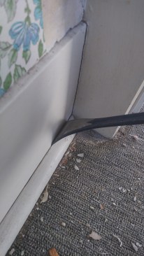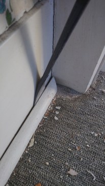 Before the door casing can be removed, the carpet mold and baseboard need to come off.