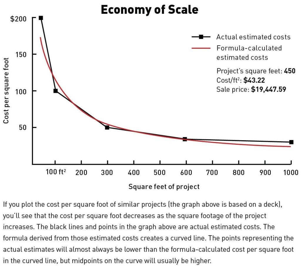 That’s because there is an inherent “economy of scale” that should allow you to charge less per square foot for a 300-square-foot deck than for a 150-square-foot deck. Some of the items that cause this price variation include mobilization, material ordering and receiving, dust protection, trash hauling, inspections, project management, client management, daily cleanup, punch out, and final cleanup.