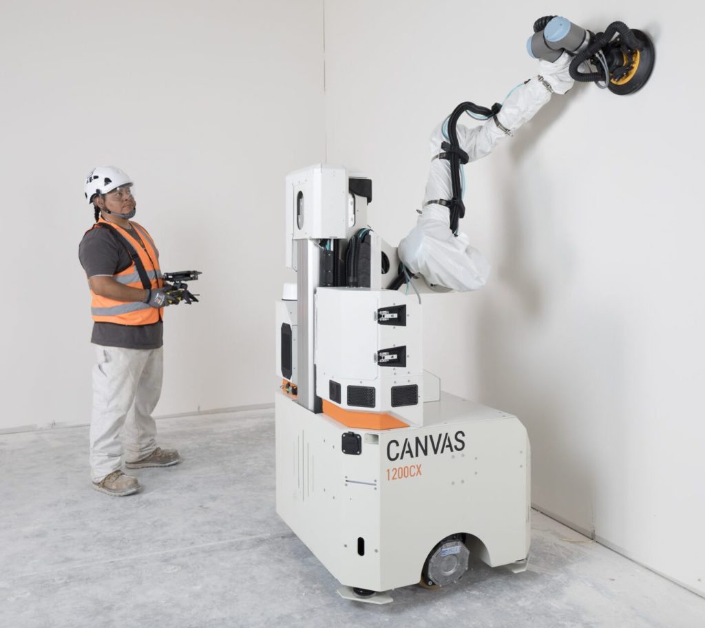 Canvas, another U.S. company, offers semi-autonomous robots designed to finish drywall alongside human crew members. The robots mud and sand gypsum board to a high-quality level 5 finish. The machines first spray joint compound across panel seams in one coat. Once dry, they use an automated sanding head to smooth the surface, while an integrated vacuum captures 99.9 percent of dust generated. The 1200CX, which is the latest model, has a 30” x 34.5” footprint with a 12’ reach, offering high maneuverability and versatility. According to the manufacturer, the robot “reduces the number of touchpoints to finish a wall by 40%.”
