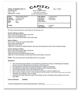 After the clients signed the original proposal for this job — which involved installing aluminum trim coil over existing exterior trim at a cost of $18,850 — they decided they also wanted the house’s siding and deck stained. The new work is carefully detailed on this AWA (additional work authorization) form; one-third of its $9,600 cost is due upon signing.