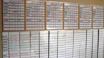 Figure 1. The framed boards on top show where each carpenter will be for the next six weeks. The boards on the bottom show what will be happening on each job for the next 10 weeks.