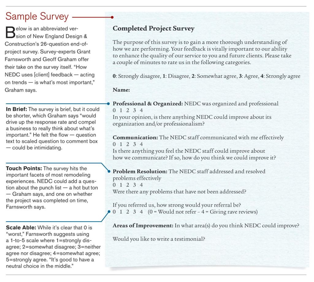 Dave Supple, owner of New England Design & Construction, in Boston, sends his surveys (see sample, above), created in Google Docs, to clients via email. “We get a better response rate with the computer because it’s easy to use, but if they don’t fill it out,” he says, “I’ll just keep following up with them.”