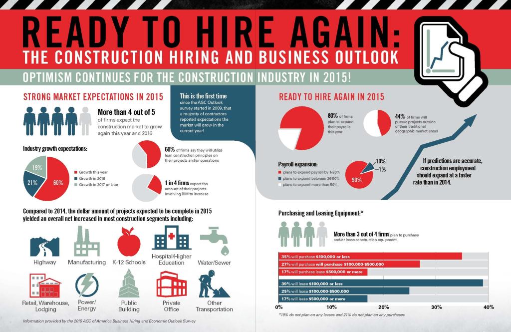 According to a survey conducted by the Associated Contractors of America, an overwhelming majority of construction firms planning to expand their payrolls in 2015 (see survey results: “Ready to Hire Again: The 2015 Construction Hiring and Business Outlook” – PDF). When asked, contractors reported they expect demand to grow or remain stable in virtually every market segment, and they feel confident enough in the market holding strong to risk buying or leasing new equipment again. Stephen E. Sandherr, the ACG’s CEO comments. “Indeed, if their predictions prove true, industry employment could expand this year by the most in a decade.”