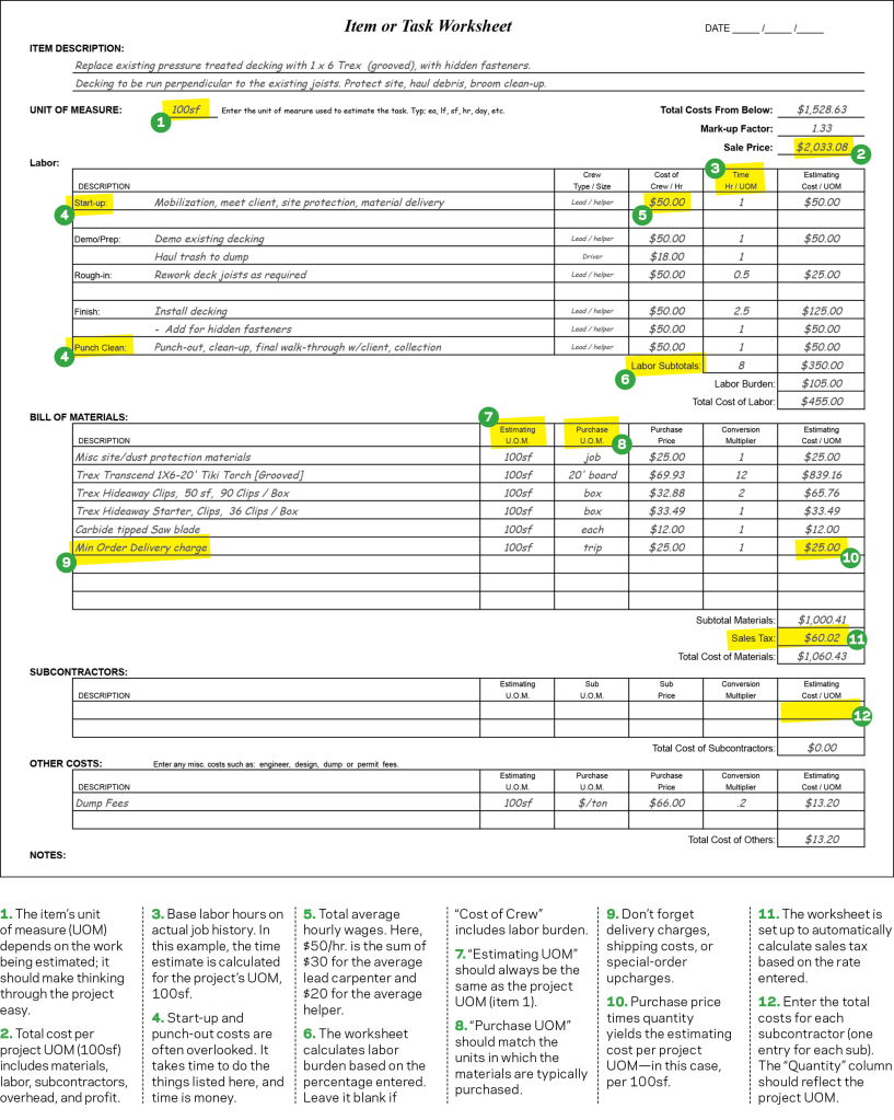 Here, I begin by illustrating how the stick-method form works. I’ve put together an example that lists all the cost for replacing 100 square feet of decking. As you read through the example, keep the following points in mind: