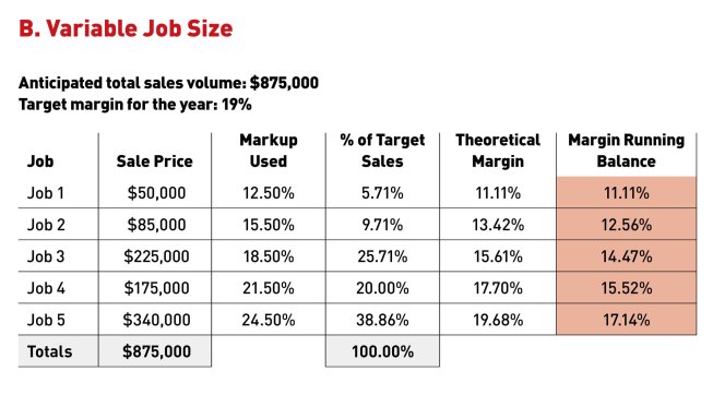 To keep things simple, we’ll assume all the jobs were sold at the same price. Notice that with greater markup increases (5% instead of 3%), this company comes closer to meeting its target margin, with an achieved margin of 18.46%.