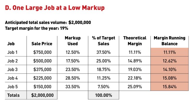 This is the same company as in the third example, but see what happens when it sells its largest job of the year at the old markup (12.5%), and the remaining projects that year are smaller (D). This time the company doesn’t come close to meeting its target margin.