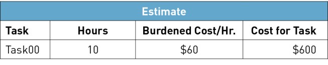 Focusing on a single task, “Task00,” let’s see how this plays out: Say you have calculated your burdened hourly rate at $60. Your estimate allows 10 hours to complete this task. Therefore, the estimated cost to complete Task00 is $600 (below).