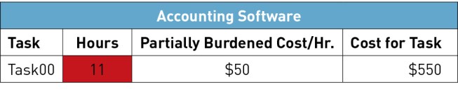 But wait! Task00 actually took 11, not 10, hours. Because the software applied only a partially burdened labor cost, it calculated a deceptively low cost of $550 (11 x $50) for the task (above). At the fully burdened cost of $60/hour, however, the actual cost for the task was $660 (11 x $60) and you’re over budget by $60 (below).