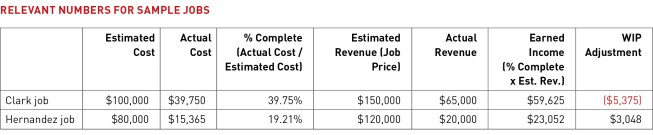 In the case of the Clark job, the customer has been overinvoiced (revenue—what has been invoiced—in excess of earned income) and the WIP adjustment is a negative number. In the Hernandez job, the customer has been underinvoiced (earned income in excess of revenue) and the WIP adjustment is a positive number.