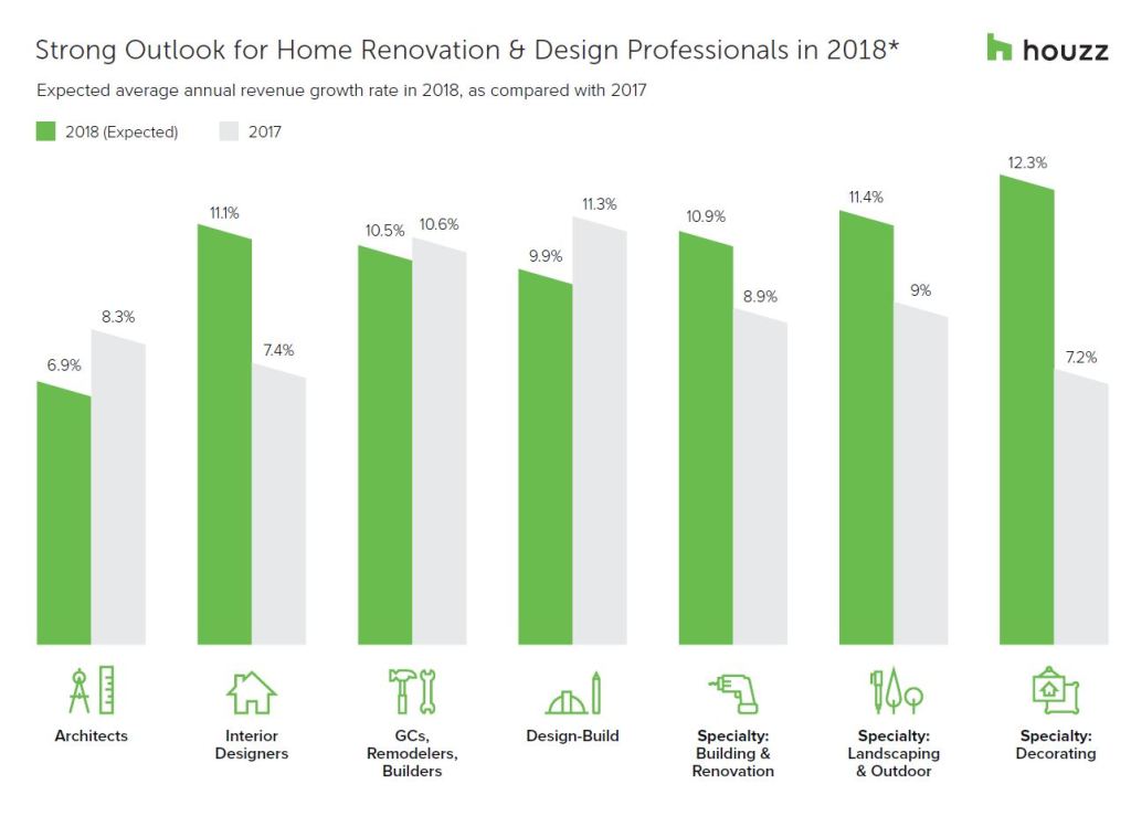Remodelers, design-build contractors, and architects are generally bullish on market conditions and expect continued growth this year, Houzz reports in its 2018 State of the Industry Survey issued today.