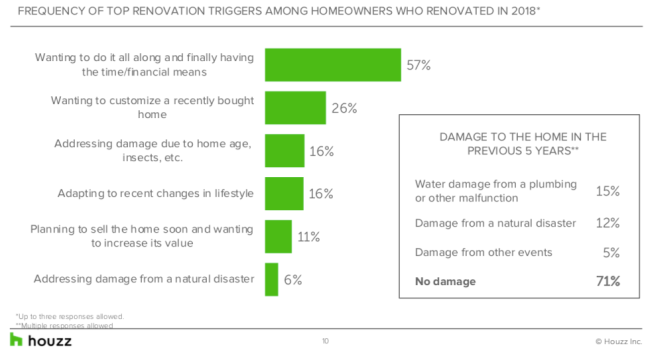 Fifty-seven percent of respondents indicated “wanting to do it all along” was the impetus for taking on a home improvement project in 2018, the top trigger for remodeling. Wanting to address damage—either due to a home’s age or a natural disaster—was also a major driver of home renovations in 2018. Nearly three in ten renovating homeowners reported damage from a plumbing malfunction, a natural disaster, or another event in the past five years.