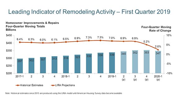 The previous LIRA, released in January 2019, predicted year-over-year increases in residential remodeling expenditures would shrink to 5.1% through the fourth quarter of 2019.