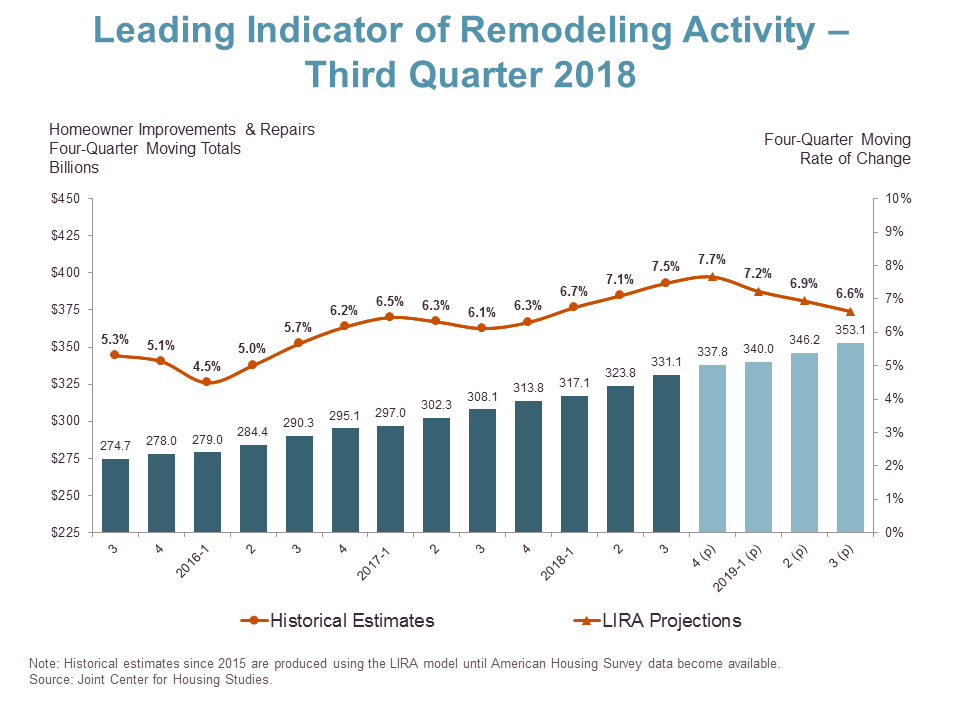 Annual growth in remodeling spending is expected to soften in 2019, according to the latest Leading Indicator of Remodeling Activity (LIRA) released today by the Remodeling Futures Program at the Joint Center for Housing Studies of Harvard University. The LIRA projects that residential remodeling expenditures year-over-year increases will reach a decade high of 7.7% this year before falling back to 6.6% through the third quarter of 2019.