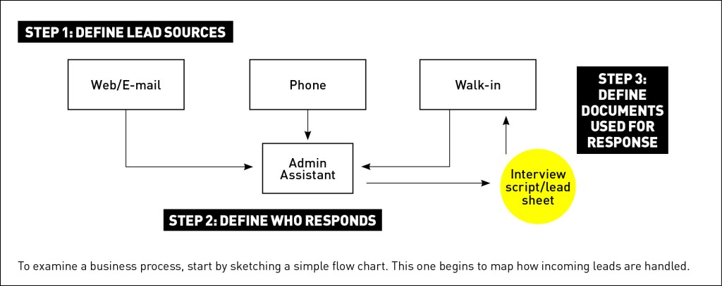 The diagram above is one example that examines leads coming via three pathways—website/e-mail, phone, and walk-ins (if you have an office or showroom). Start by drawing boxes for those three lead sources, and then define who responds to each one. Put that down, too, and link the bubbles. Here’s where you start to see whether, and how, the responses might differ, and whether that’s a good thing, something to attempt to automate, or something you want to change.