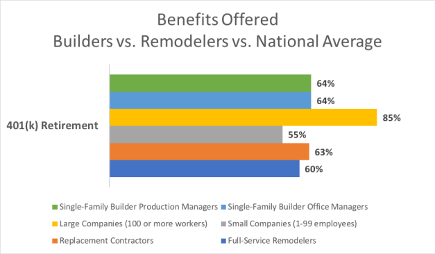 Builders are more likely to offer employees 401(k) retirement plans than remodelers and companies with fewer than 100 employees. Remodelers and builders are five to nine percentage points more likely to offer 401(k) benefits than the national average for similarly-sized companies.
