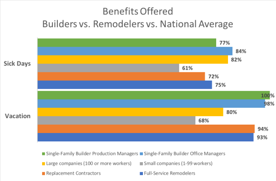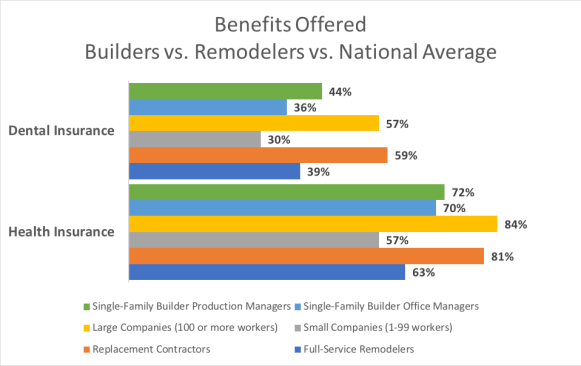 The gaps have ranges because we also have found differences between single-family builders, full-service remodelers, and replacement contractor/home improvement firms. For instance, single-family builders are more likely to offer employees retirement planning benefits, life insurance, and paid time off than full-service remodelers and replacement contractors.