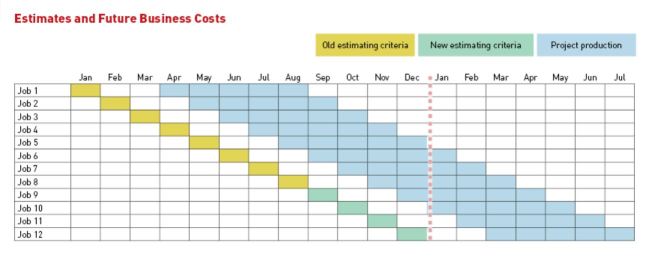 The red line represents the date on which the new costs go into effect, so ideally all projects that include that date would be estimated according to the new parameters. As you can see, Jobs 6 through 8 extend into this time period but were estimated according to the old criteria. Given the increase in labor costs, these jobs should produce lower-than-anticipated profit.