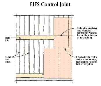 - Q. We’re building a three-story house with plywood sheathing that will be covered with EIFS. Because the house has 9-foot ceilings, the horizontal sheathing joints don’t fall near the band joist area. The EIFS rep says we have to plan for joist shrinkage by establishing a control joint, and he wants us to cut through the plywood sheathing at the floor line. I think the plywood sheathing is structurally important, and I’m reluctant to cut the sheathing where it ties the floors together. What should we do?
