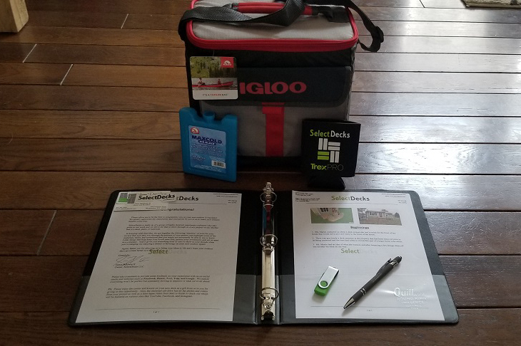 These are pretty standard customer service measures, but we’ve added another wrinkle that seems to be unusual, at least among deck builders. Shortly after wrapping up a job, we send our clients a “welcome kit.” In it, we include a cooler, a customized koozie and pen with our company’s logo and contact info, and a USB drive with all the photos and videos from the job. We use a drone to shoot some of the video, but we also make it a point to set up a GoPro camera on every job in order to produce a before-and-after time-lapse video of each project (in addition to the USB drive, we email a YouTube link of the time-lapse video to our clients so that they can share it with their friends). The kit also includes a binder that we’ve assembled with photos that summarize the job, showing the build process and highlighting some of the things they don’t get to see as we’re building.