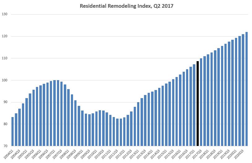 The increase to 108.7 indicates remodeling conditions are 8.7% better than the previous peak in spring 2007, 4.7% better than the 103.9 reading in the April-to-June period last year, and 1.3% better than the first quarter’s reading of 107.3.