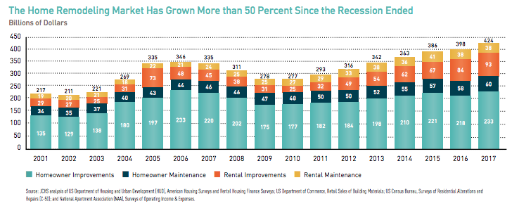 While the home building industry has lagged in the U.S., the home remodeling industry has soared since the end of the Great Recession. According to the Improving America’s Housing 2019 report from the Harvard University Joint Center for Housing Studies (JCHS), the remodeling market has expanded more than 50% since 2010. Spending on improvements and repairs to owner-occupied and rental properties hit $425 billion in 2017, according the report, a 10% increase from just two years prior.