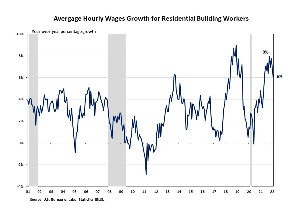Amid a tight labor market, data from the Bureau of Labor Statistics indicates the average hourly earnings for residential building workers continue to increase on a year-over-year basis. According to the NAHB, hourly earnings for residential building workers have increased significantly since the onset of the COVID-19 pandemic.