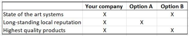 Use tables and charts. This is a commonly used technique to point out the differences between your offer and your competitorsâ in a detailed and professional way. Imagine a chart, with the salient features of your offer down the first row, and across the top your companyâs name, followed by âOption A,â âOption B,â etc. with the options being your competitors.