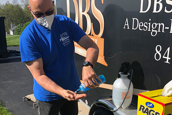 A hand-washing station (left) complete with hand soap, rinse water in a sprayer, paper towels, and hand sanitizer is currently mandatory on all jobsites (and will be after the pandemic, per company policy). An example of the laminated COVID safety signage prominently placed around the jobsite (right).