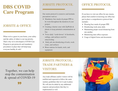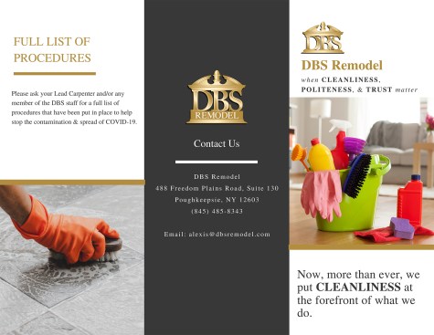 Within weeks, we had assembled our “DBS COVID Care Manual,” a 42-page document comprising New York State health and safety guidelines and office and field procedures, which we fine-tuned to our remodeling business (see “Field Procedures for Interior Renovating” excerpt on facing page). The manual served as a training resource for our workers and trade partners, and though it wasn’t required in the field by law, we could easily access the document on our phones via our Buildertrend app if we needed to refer to it. We also handed out flyers with condensed information from the manual to the homeowners (see below).