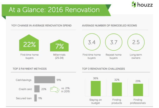 7. Homeowners Are Using Credit Cards – According to the study, the top payment method is cash/savings with 91%. This finding is consistent with last year’s findings, but the survey also found credit cards are rising in funding popularity, with 23% reported in 2016 compared to 21% in 2015.