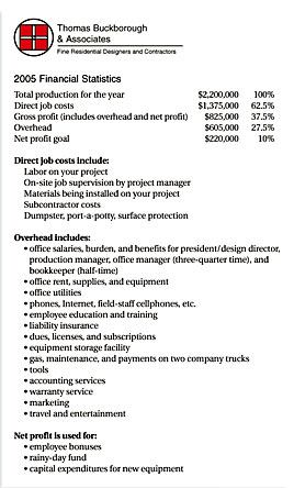 I use several sources of information. For instance, I have a typed sheet (shown at left) that explains our particular financial formula for the year, including expected job-cost, overhead, and profit percentages. I’ve listed the types of expenses in each category and how they are related to the job.