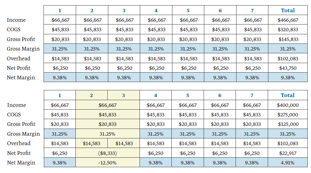 But let’s see what happens when one of the jobs takes twice the estimated duration (see second chart, above). Instead of wrapping up in time period #2, this job continues into time period #3. The result is that there is twice as much overhead ($29,166) for the same amount of gross profit ($20,833), leading to negative net profit (-$8,333) and the inability to cover overhead. Note that although achieved gross margins on individual jobs look fine, total revenue drops because fewer jobs are being completed in the given time period. As a result, overall profit drops and cash-flow challenges can occur. If this happened twice, or more, the results would be even more dramatic.