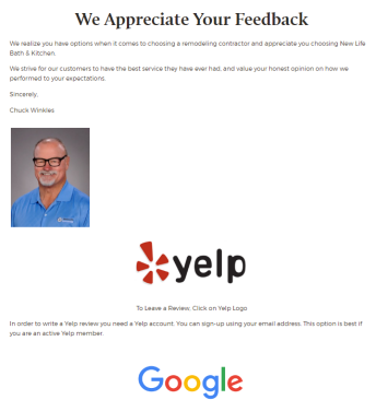 By not asking for a review on a specific network, you’re allowing your customer to leave online feedback on the platform they’re most comfortable. The reality is not everyone is active on Yelp and not everyone has an account on Houzz.