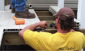 Figure 7. Low maintenance is a big selling point; the author installs only vinyl decking. Because tongue-and-groove products like the decking shown above may drain surface water slowly, it’s important to ensure the framing is flat to avoid ponding.