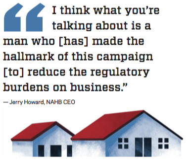 When it comes to regulations, Howard says, “I think what you’re talking about is a man who has [made] the hallmark of his campaign [to] reduce the regulatory burdens on businesses.” In discussing ways in which the NAHB could work with Trump, Howard mentioned the potential for rolling back “overzealous” environmental and labor regulations.