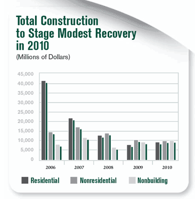 Florida is ground zero for the national housing market collapse, and heads into 2010 after several tough years. Says the McGraw report: “The housing market, which had buttressed the state’s economy in the early 2000s, is still deeply troubled. Foreclosures are among the highest in the nation, and prices continue to plummet. With no income tax, Florida relies heavily on the housing market for its revenues. Consequently, plunging home values and property taxes have put the state budget perpetually in the red. The housing collapse has also damaged consumer confidence and decimated retail spending.” But the housing market slide may be ending, says the report: “Hope is emerging that the bottom is close. One the single family side, home sales are finally beginning to stabilize after years of steep declines. Florida Realtors reported that single family home sales were up 26% through October 2009 and were up 46% over a year earlier.” McGraw-Hill projects a “modest recovery” for total construction in 2010 — led by “the first increase in single family construction since 2005.”
