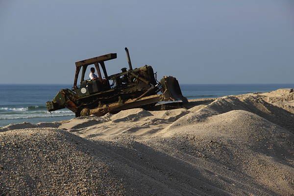 Bulldozers construct artificial dune barriers along the shore between the Atlantic Ocean and the town of Mantaloking, N.J., on June 27. Most of Mantaloking’s houses were damaged or destroyed by Hurricane Sandy flooding, but some landowners there are fighting a state and federal project to protect the town and surrounding towns from future flooding by constructing high dunes. Below: a newly rebuilt house peeks over the top of an artificial dune. Bottom: A Mantaloking oceanfront home still in ruins from Hurricane Sandy storm surge flooding. (Photos by Ted Cushman)