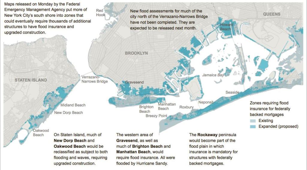 The New York Daily News chimes in: (“FEMA releases new flood maps showing 35,000 more New York City, Westchester buildings at risk,” by Christina Boyle and Erin Durkin). “People whose homes are in the flood zone will have two years to elevate their buildings to protect them from surging seawater or begin to face huge spikes in their flood insurance premiums,” explains the News. Said FEMA official Mike Byrne: “We are really committed to . . . building back in a way that it doesn’t get damaged again. If you want to take on more risk, your premiums are going to be more expensive.”