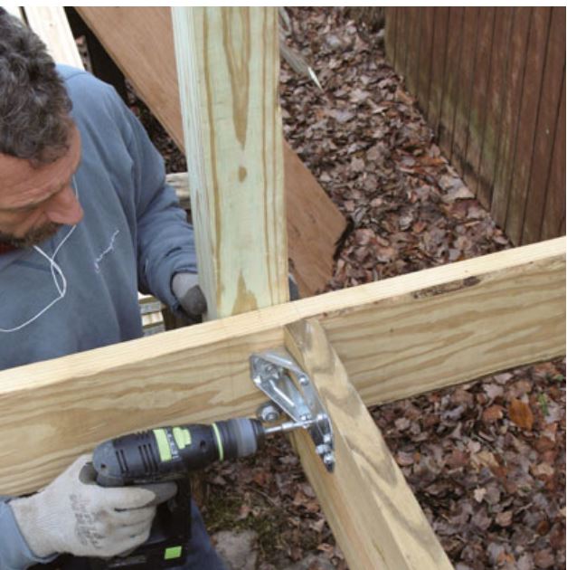 This post detail – which relies on blocking, ½-inch bolts, and screws – failed the load test. In fact, the only post details that passed the authors' testing were ones made with load-rated metal connectors. Without the connector approach, the deck band “peels off” at load levels between 20-75 percent of the test requirement.