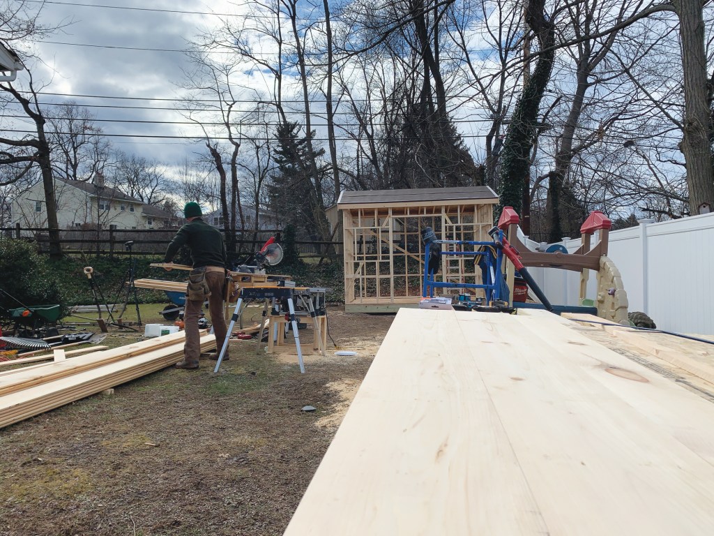 A recent shed build is a good example. My yard delivered the cube packed for shipping, not for how I’d use the building materials in it, so—like all deliveries—everything was tangled up. As I broke the cube down, I staged the customer’s yard in clusters—joists, sheeting, studs, and so on—in a line. If instead I told a laborer to unpack the materials, the chances somebody would be moving that pile more than once would go up about 1,000%.