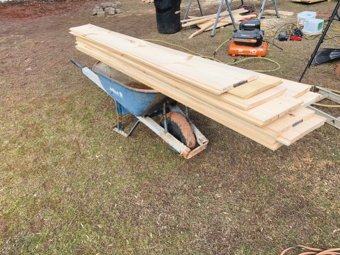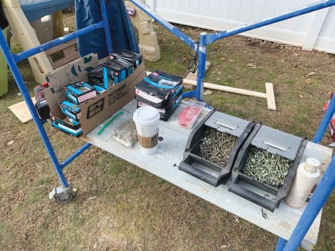 I’m rabid about setting up my jobsites in a linear fashion so I can get to what I need as I need it. Where possible, I try to break the components out in related clusters of stuff rather than just going for the stuff I need first, then piling other stuff on top of other stuff. Kind of like a buffet, but heavier. Also, it’s sometimes handy to have a few hunks of 2-by ahead of time for dunnage.