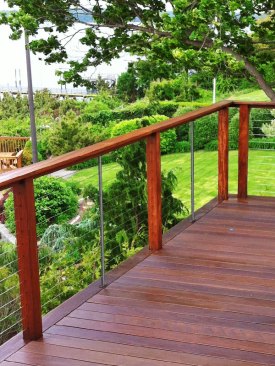 Consider a square residential deck with a perimeter of 60 feet, wood railing on all 4 sides and 10 cables. With single corner posts, the cables would run just 15 feet before terminating at each corner. At that length, the cables would cost about $27 per linear foot of railing.