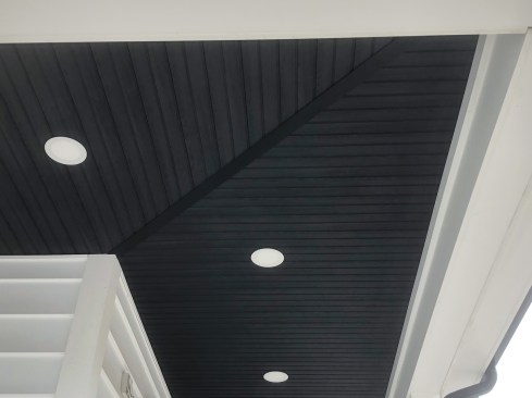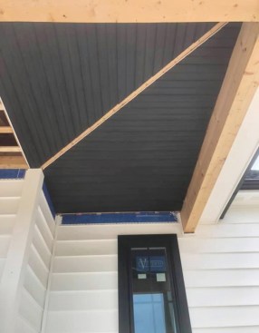 At my recommendation, natural wood was out. Not long before, I had completed a similar project using stained tongue-and-groove (T&G) pine, and I was disappointed by its premature need for refinishing. Black vinyl soffit was an option, but I wasn’t sure it would be tough enough in these coastal conditions.