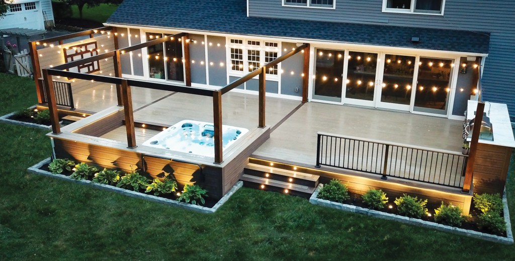While the hot tub has a full lighting package that provides adequate illumination around the area, we also fitted the risers with LED puck lights, which by code need to be at least 5 feet from the hot tub. A simple overhead beam design adds vertical elements to the space for mostly aesthetic purposes but also includes a misting system to keep the deck cool in the summer and serves as a great mounting point for overhead string lights.