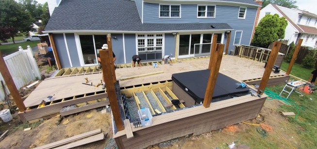 After framing the deck, we formed and poured a 4-inch-thick concrete slab on top of a compacted crushed stone sub-grade base to support the tub. One of the biggest challenges in framing this project was leaving access to the hot tub’s operating parts for maintenance and service, which we solved by designing a liftable hatch on the lower deck. Power is supplied by a subpanel next to the hot tub, with an emergency shutoff nearby. We mounted the shutoff on the front side of the deck where it would be both code-compliant and less obtrusive.