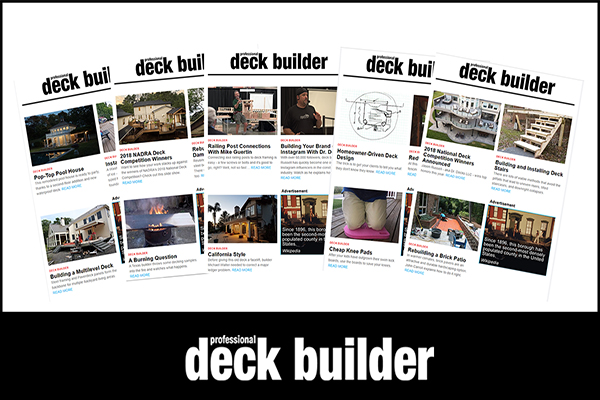 All readers of the PDB newsletter will receive a complimentary (and automatic) subscription to the weekly JLC Update newsletter. Here, you’ll find a deep well of “by builder, for builder” resources on a broad range of construction-related topics, including regular PDB deck coverage. Meanwhile, you can keep your finger on the pulse of the deck building community by checking deckmagazine.com regularly. Thanks for becoming – and remaining – a part of the PDB community. We are still here, and will continue to look for new ways to feed your need for deck building knowledge.