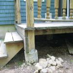 Footing size. Some deck builders use rules-of-thumb to size footings that may or may not be adequate. Others err on the side of caution and dig unnecessarily oversized footings. A third option for math-averse (but cautious) deck builders is to refer to DCA6’s prescriptive footing sizing table, which supplies footing sizes based on the beam span and joist span. The footing sizes are conservative—the assumed soil bearing capacity is 1,500 pounds per square foot (psf)—and not all beam and joist spans are listed, so often you have to move up to the next larger span. Unless your soils are really poor, you can’t go wrong using the prescriptive method.
